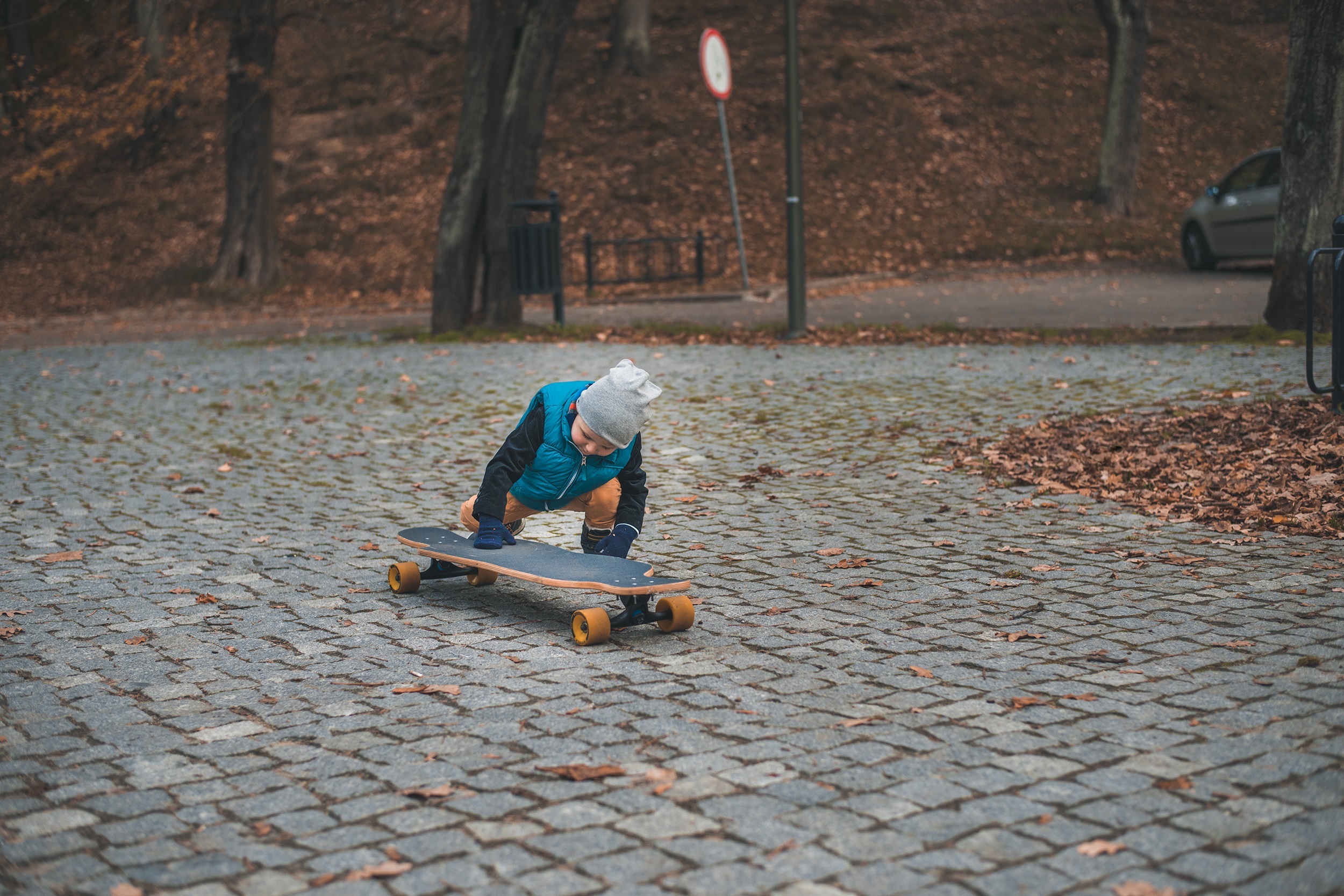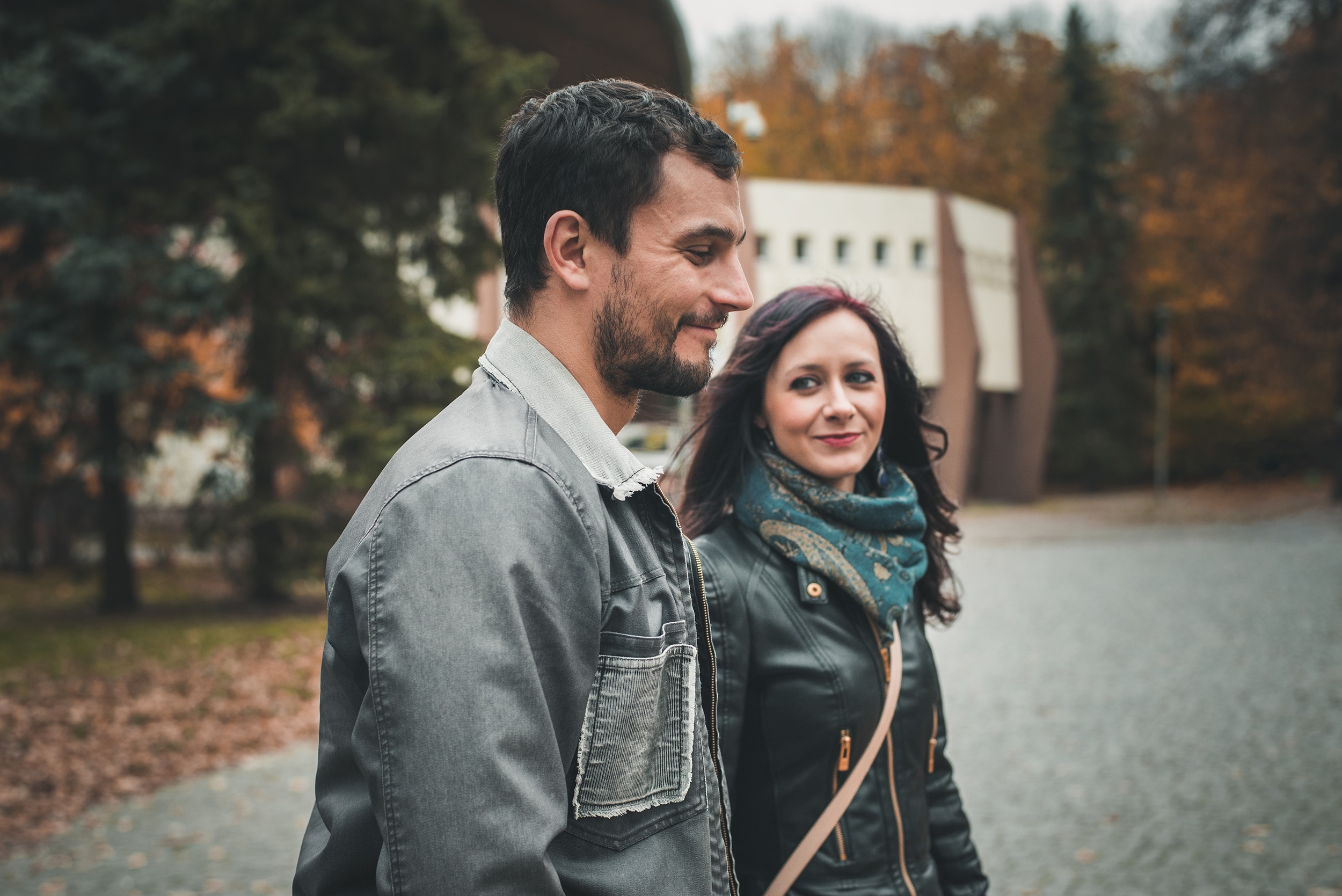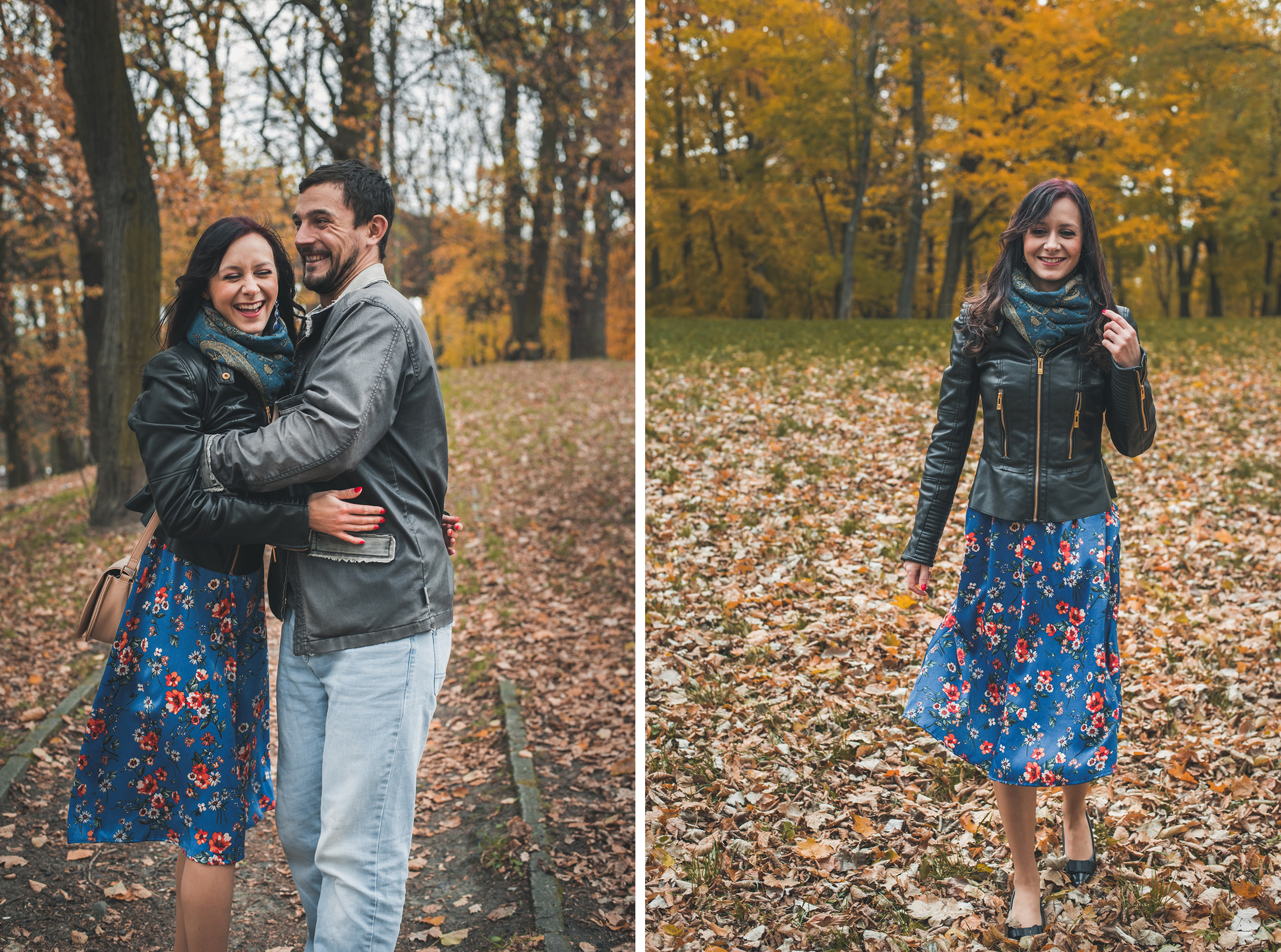 Prośba, żeby nie zwracać na mnie uwagi, została przyjęta z uśmiechem i natychmiast wzięta do serca. Plan był prosty – szukać najbardziej żółtych liści, szurać nogami i śmiać się tak bardzo, że będą boleć brzuchy. Olaf systematycznie uciekał sprzed obiektywu, co pozwoliło na złapanie kilku intymnych spojrzeń i gestów zakochanej pary. Hitem była także deska, i nie wiem, jak to się dzieje, ale Olaf, który nigdy nie jeździł, po chwili znalazł własny styl jazdy i śmigał o niebo lepiej niż ja.