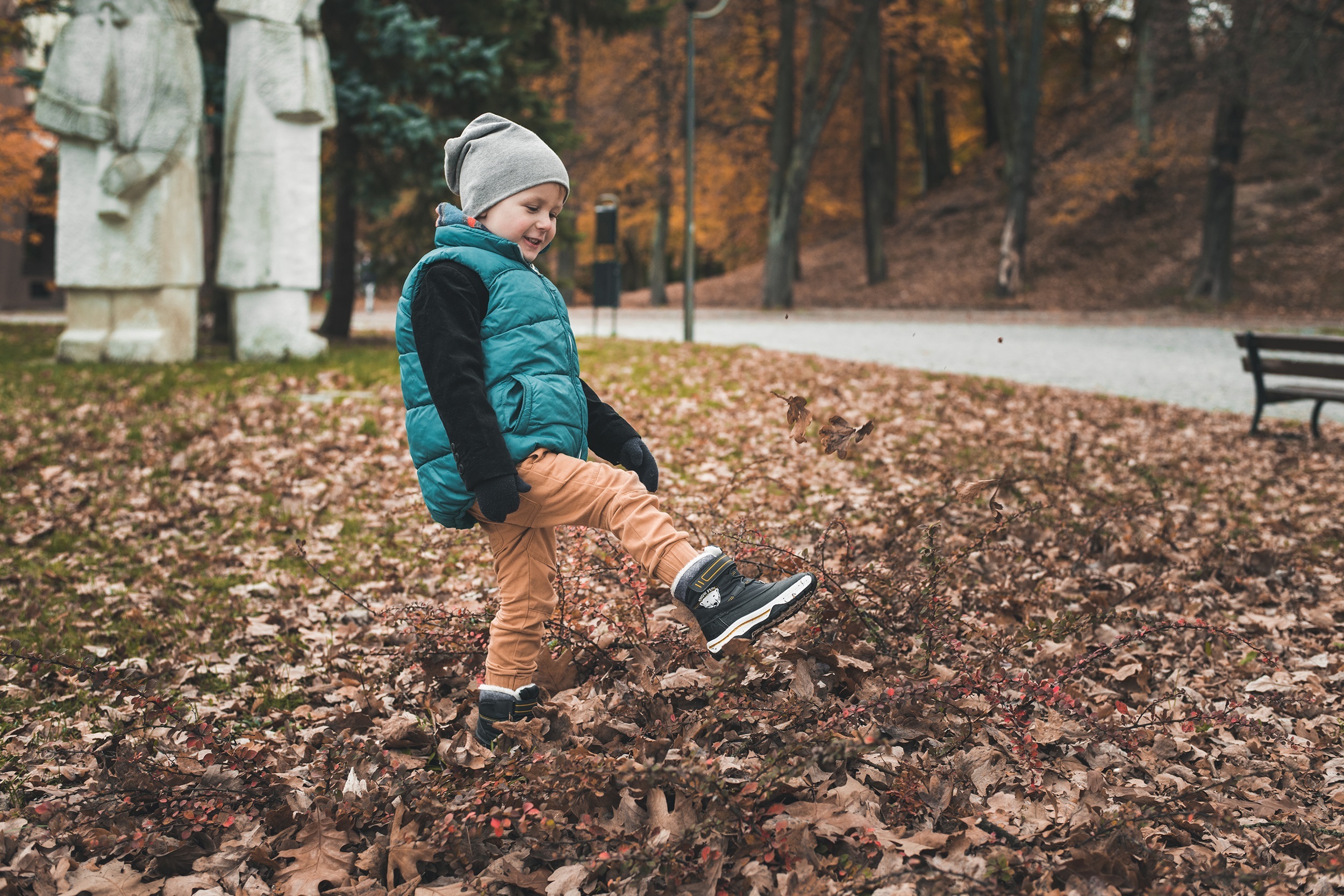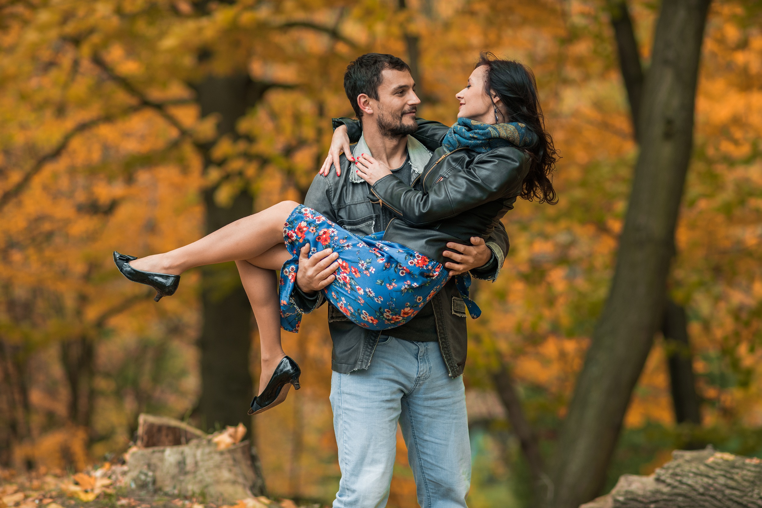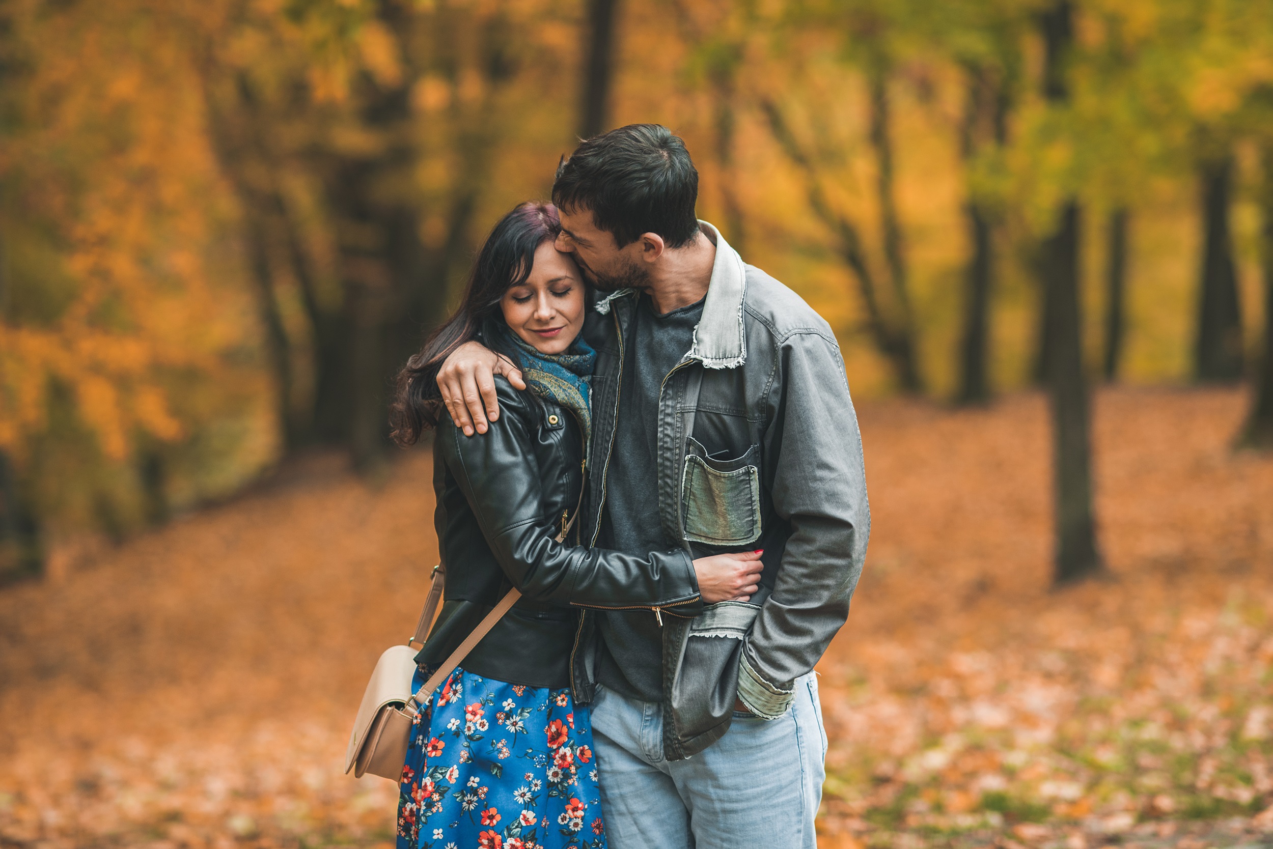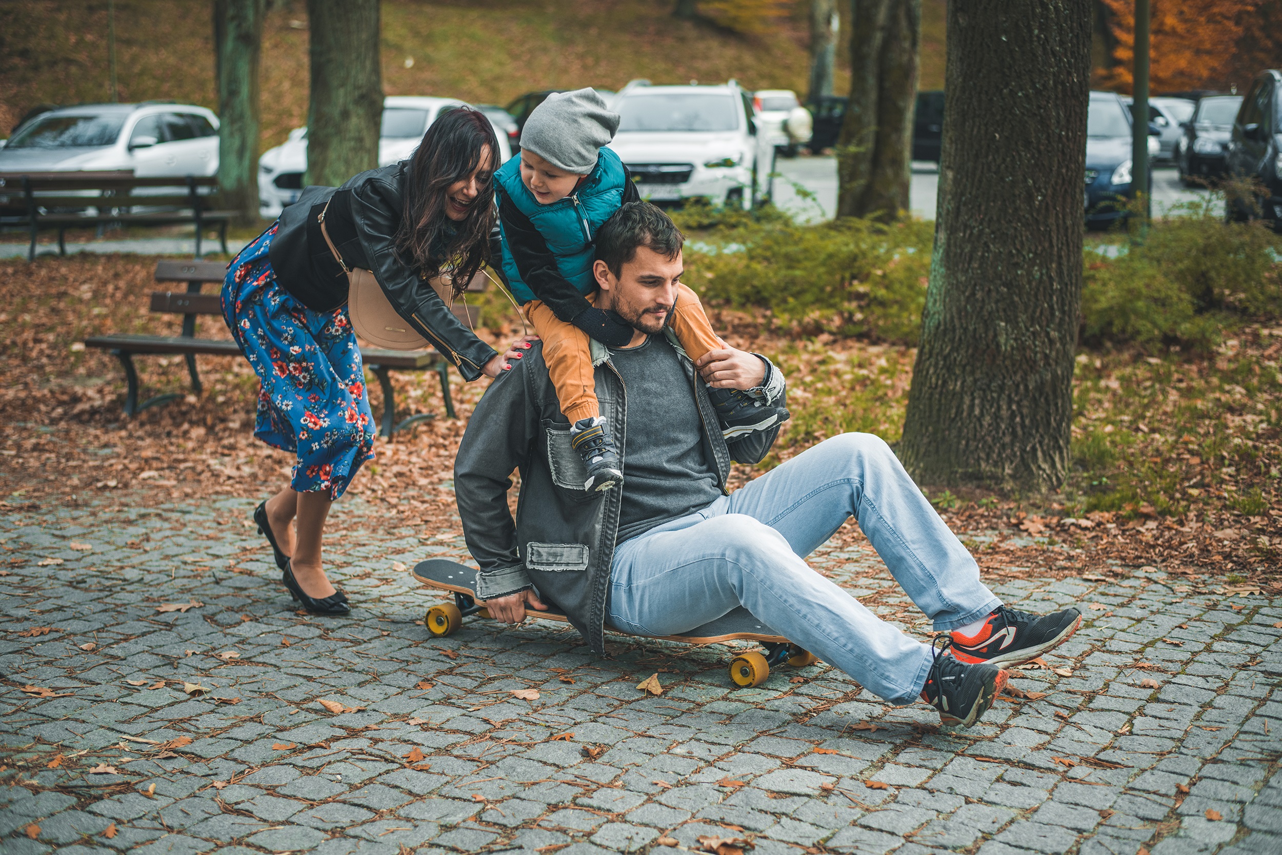 Prośba, żeby nie zwracać na mnie uwagi, została przyjęta z uśmiechem i natychmiast wzięta do serca. Plan był prosty – szukać najbardziej żółtych liści, szurać nogami i śmiać się tak bardzo, że będą boleć brzuchy. Olaf systematycznie uciekał sprzed obiektywu, co pozwoliło na złapanie kilku intymnych spojrzeń i gestów zakochanej pary. Hitem była także deska, i nie wiem, jak to się dzieje, ale Olaf, który nigdy nie jeździł, po chwili znalazł własny styl jazdy i śmigał o niebo lepiej niż ja.
